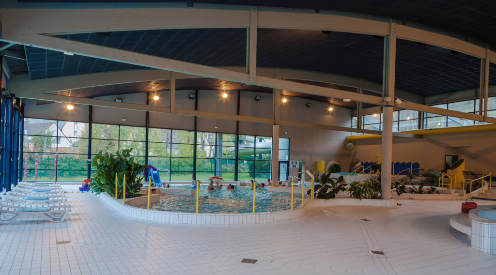 La piscine de Kayserberg est un complexe nautique complet : couloirs de nage, toboggan, espace bien-être, sauna, hammam, aquabike…
